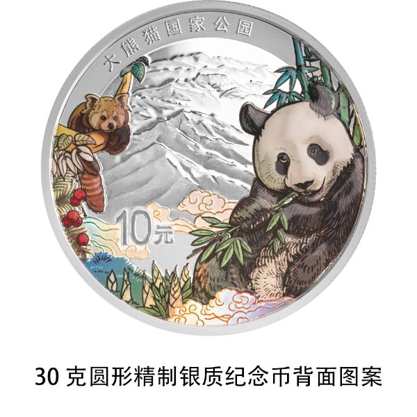 大熊猫国家公园30克圆形银质纪念币背面图案为大熊猫、小熊猫、珙桐等元素装饰组合设计,衬以大熊猫国家公园自然景观,并刊“大熊猫国家公园”字样及面额。