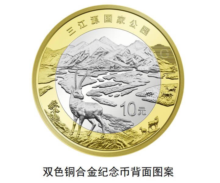 三江源国家公园双色铜合金纪念币背面主景图案为藏羚羊和三江源典型地貌等,辅以绿绒蒿、野牦牛、黑颈鹤等,并刊“三江源国家公园”字样及面额。