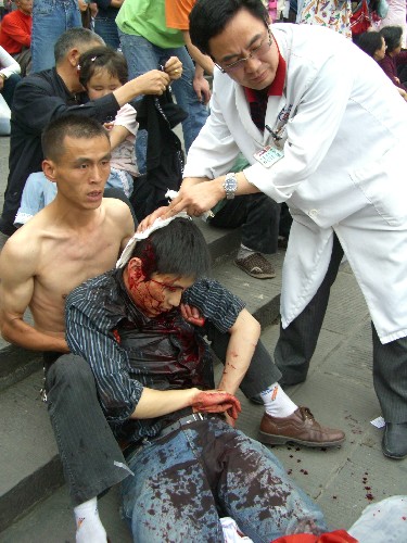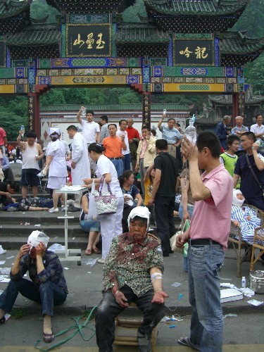 5月12日,受伤群众在都江堰景区门口接受治疗。 当日14时28分,四川汶川县发生7.8级地震,离汶川约100公里的都江堰市部分设施受损,多处房屋发生倒塌,目前伤亡情况正在统计之中。 新华社记者郑悦摄