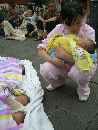 5月12日,护士正在照料从都江堰人民医院转移出来的婴儿。 当日14时28分,四川汶川县发生7.8级地震,离汶川约100公里的都江堰市部分设施受损,多处房屋发生倒塌,目前伤亡情况正在统计之中。 新华社记者郑悦摄