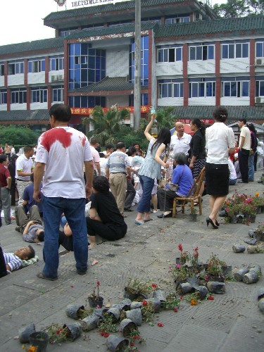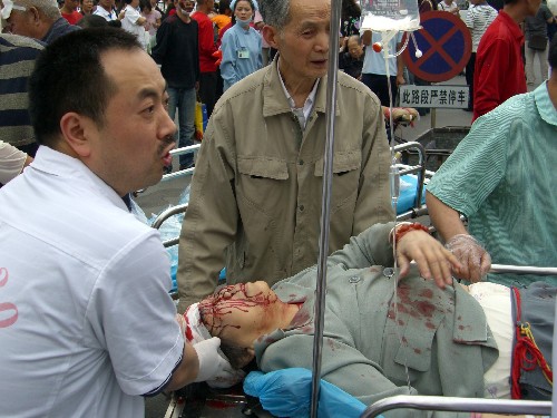5月12日,受伤群众在都江堰人民医院门前等待接受治疗。 当日14时28分,四川汶川县发生7.8级地震,离汶川约100公里的都江堰市部分设施受损,多处房屋发生倒塌,目前伤亡情况正在统计之中。 新华社记者郑悦摄