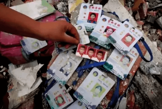 🔼 震后废墟上,一位家长在散落的遇难学生的学生卡里,寻找自己孩子的照片。
