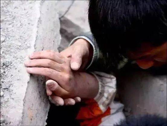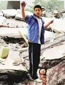 🔼 男孩廖波被倒塌的建筑物埋压,生命垂危之际,其好友李阳举着吊瓶一直陪伴在他身边,经过一天一夜的守候,廖波最终获救。