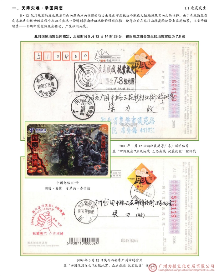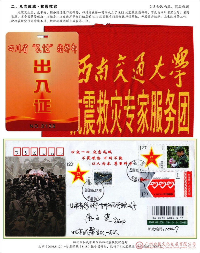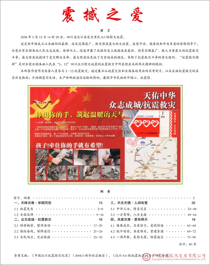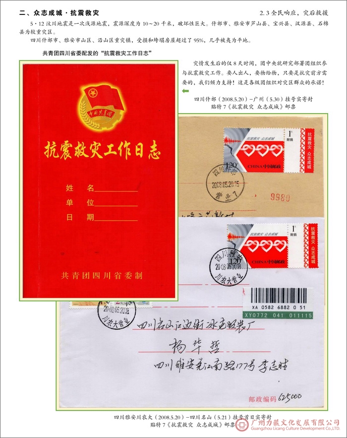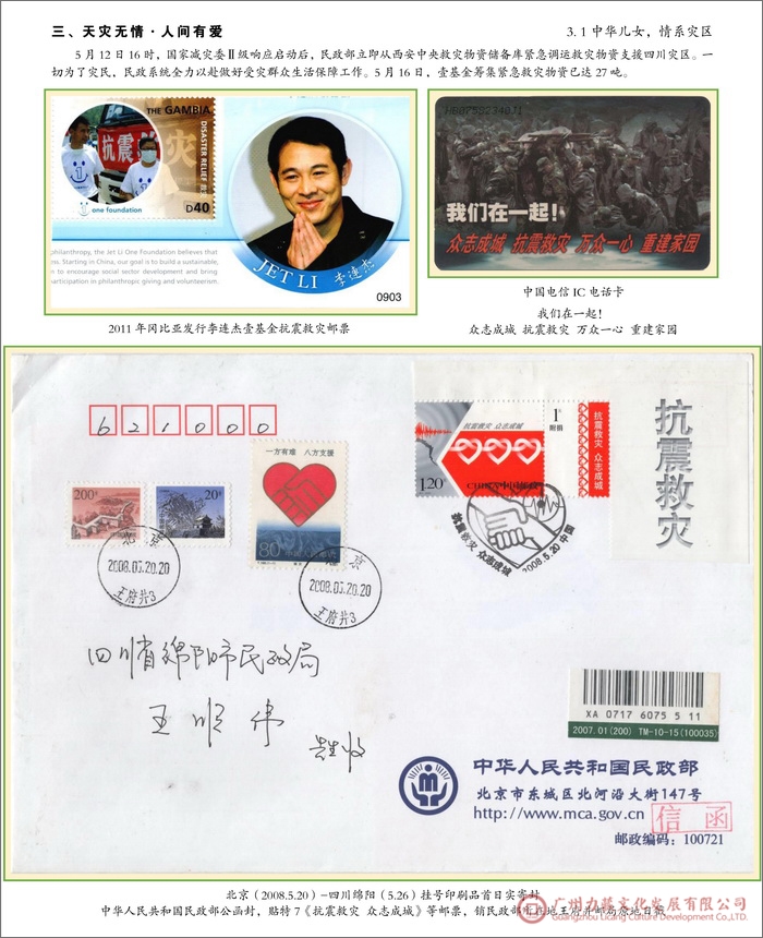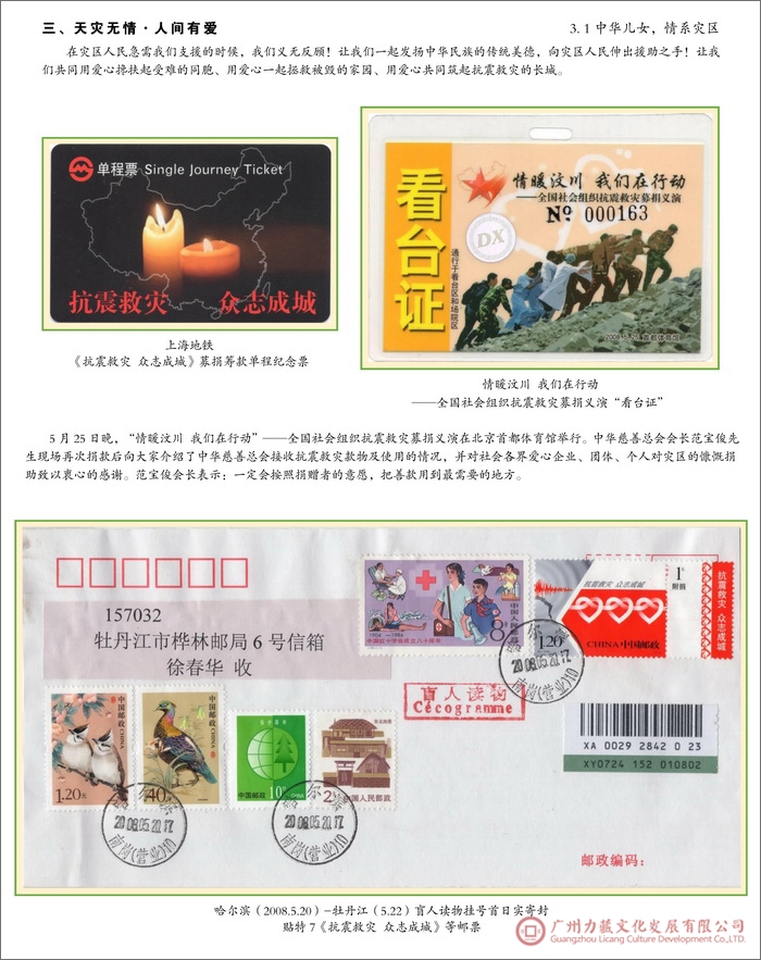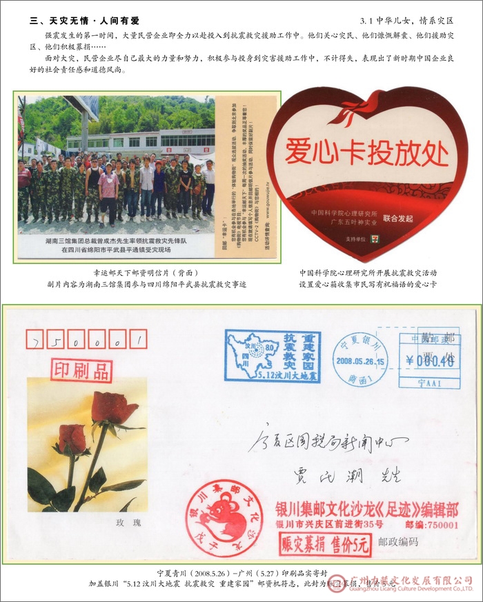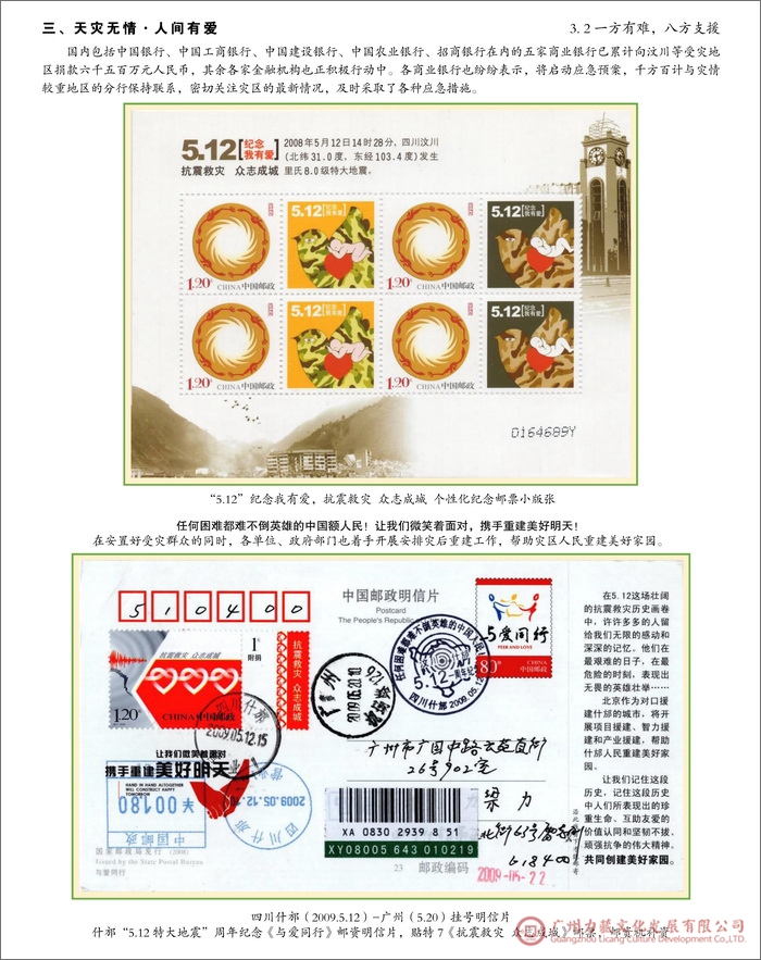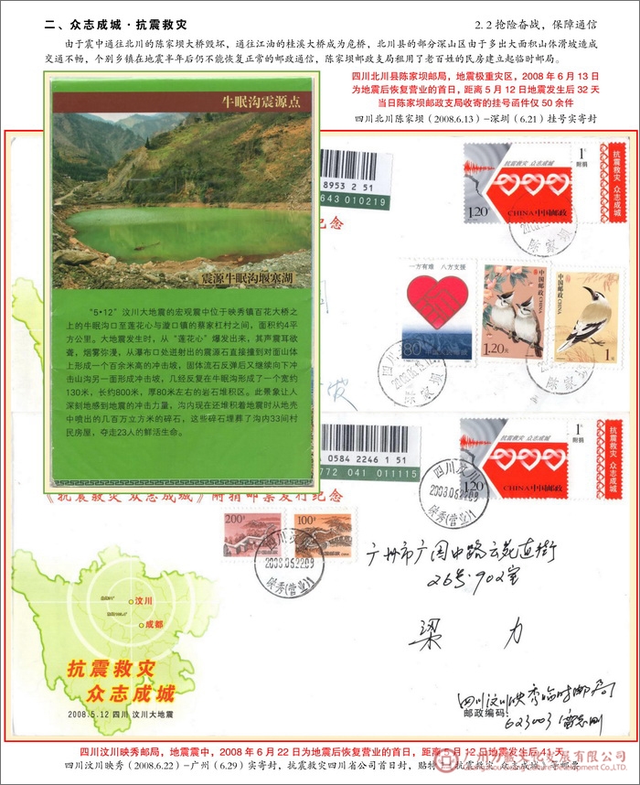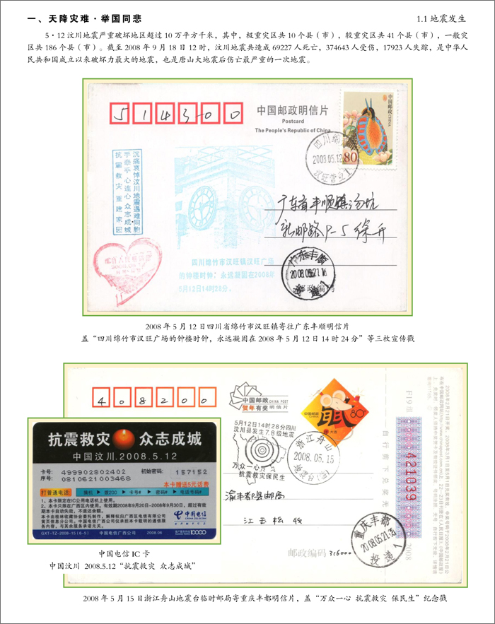 本邮集作者作为医务人员参与5·12抗震救灾,通过展示从地震灾区和全国各地寄出的实寄封片,以及反映抗震救灾的真实历史物品;介绍强震对生活、生产和邮政通信运输的影响,展现中华民族的中国心、抗震情。