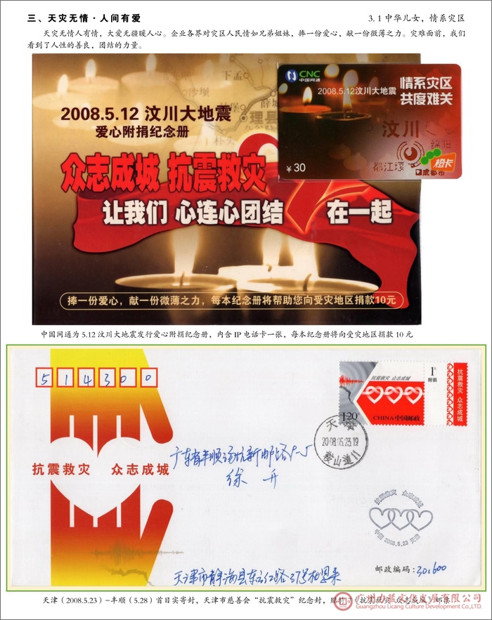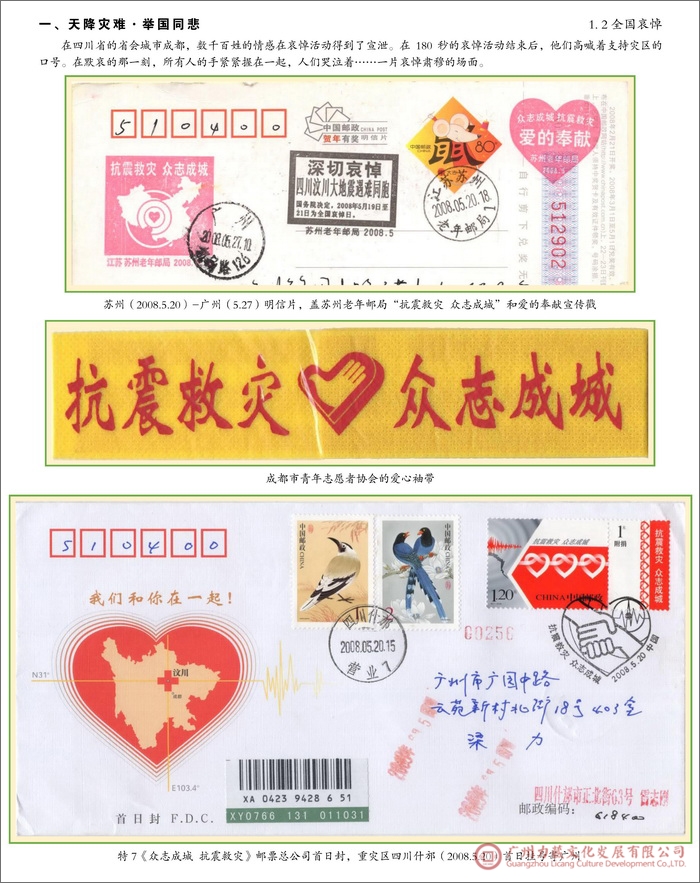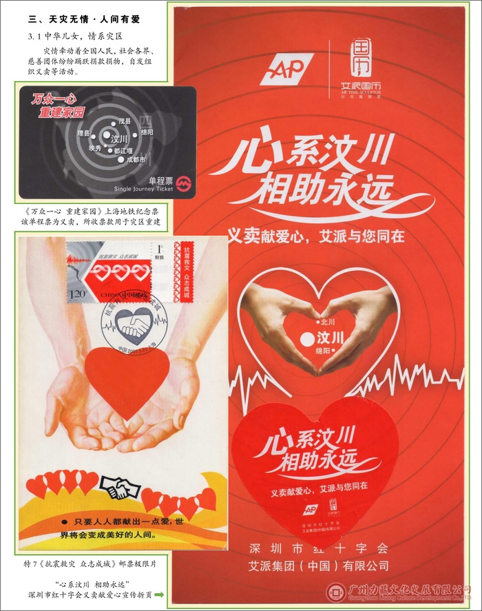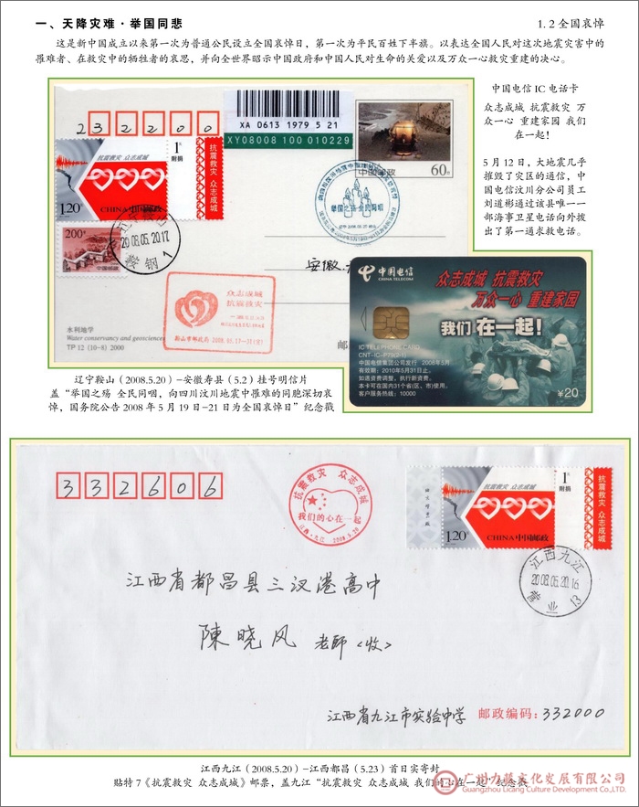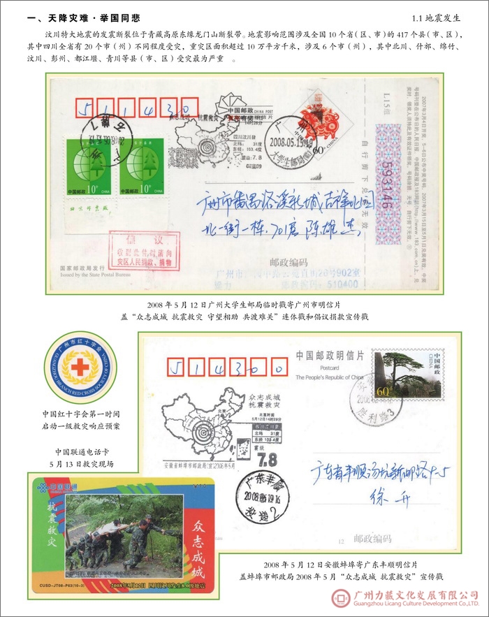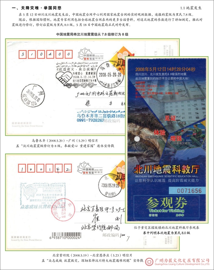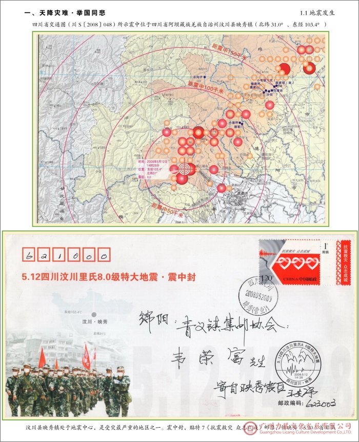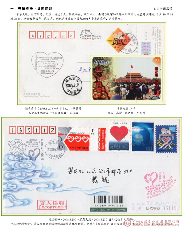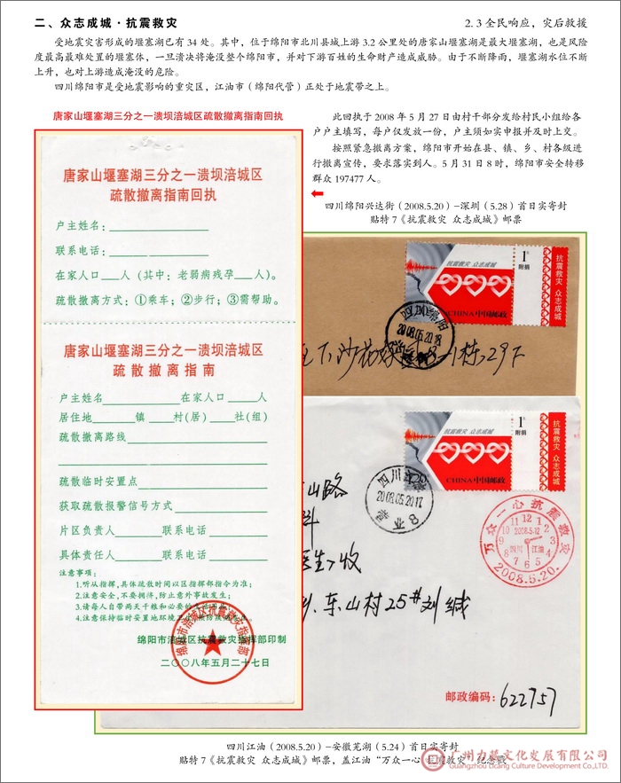 本邮集作者作为医务人员参与5·12抗震救灾,通过展示从地震灾区和全国各地寄出的实寄封片,以及反映抗震救灾的真实历史物品;介绍强震对生活、生产和邮政通信运输的影响,展现中华民族的中国心、抗震情。
