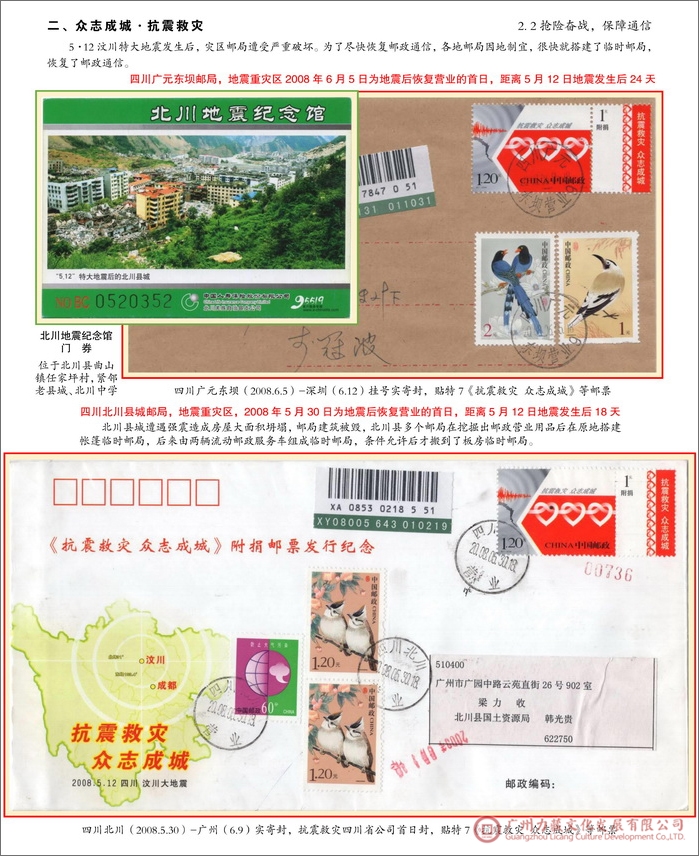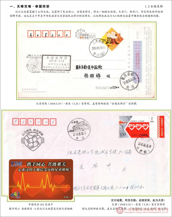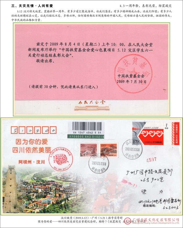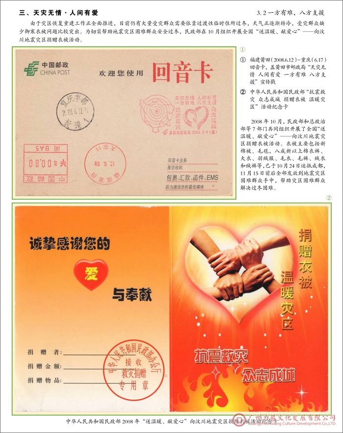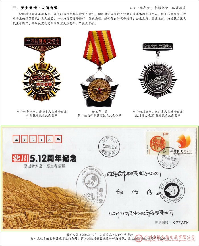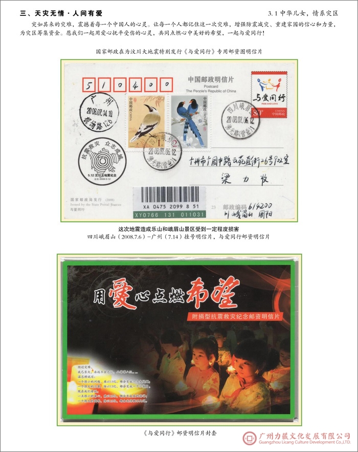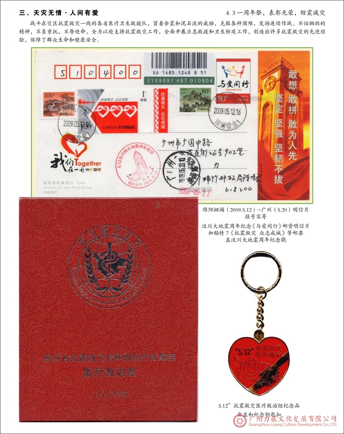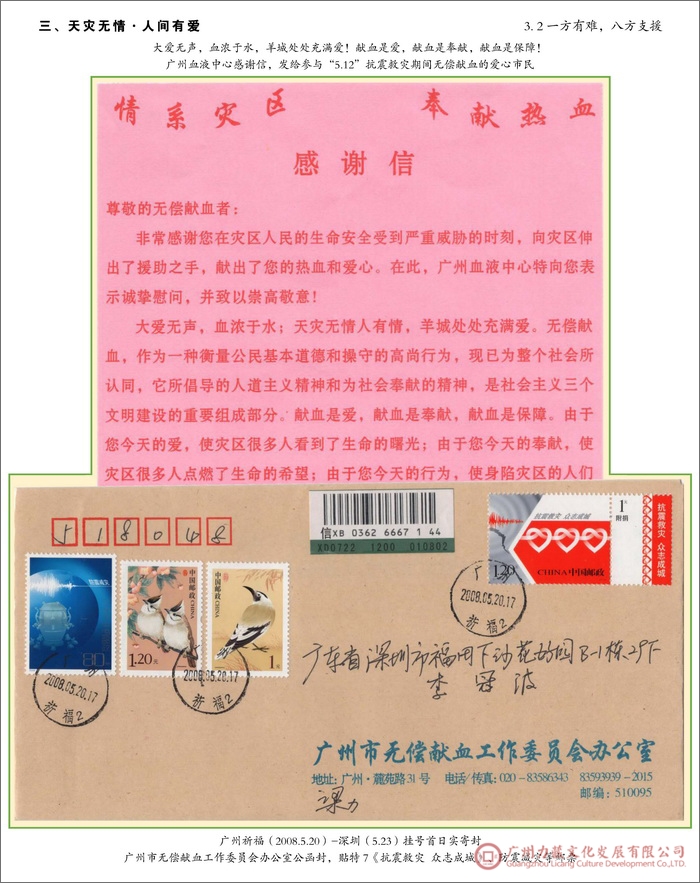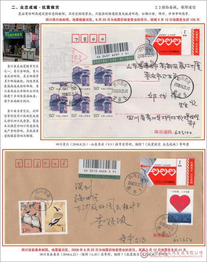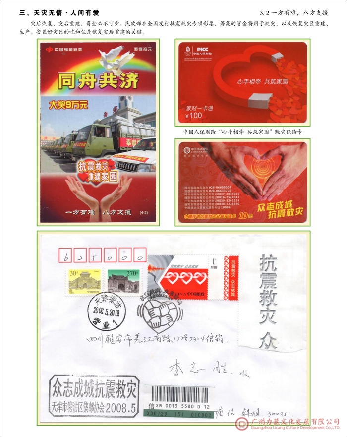 本邮集作者作为医务人员参与5·12抗震救灾,通过展示从地震灾区和全国各地寄出的实寄封片,以及反映抗震救灾的真实历史物品;介绍强震对生活、生产和邮政通信运输的影响,展现中华民族的中国心、抗震情。