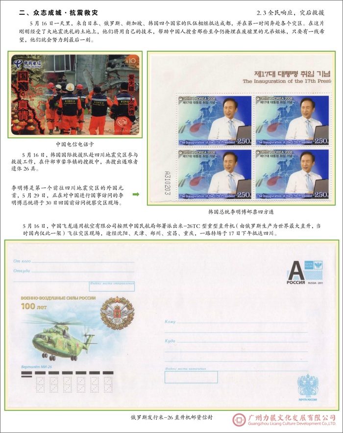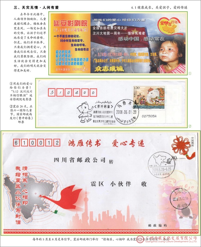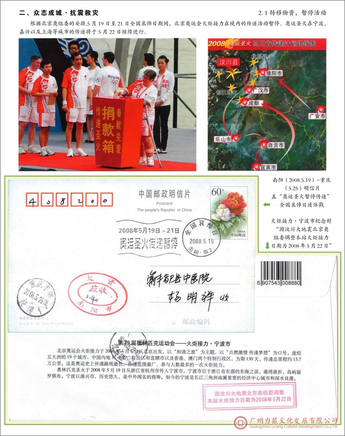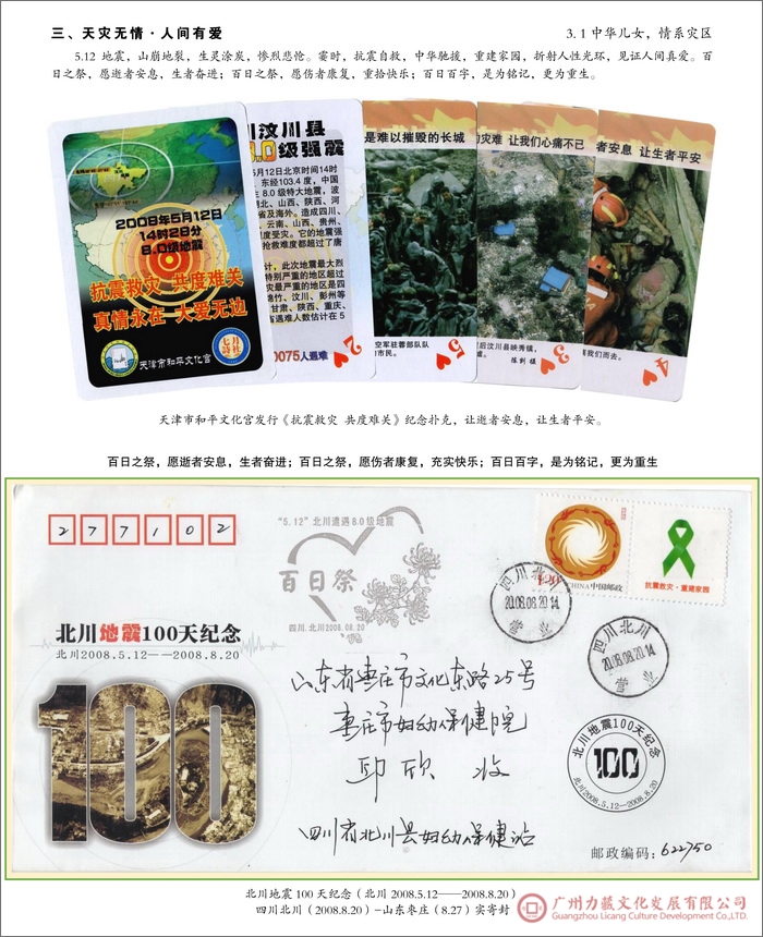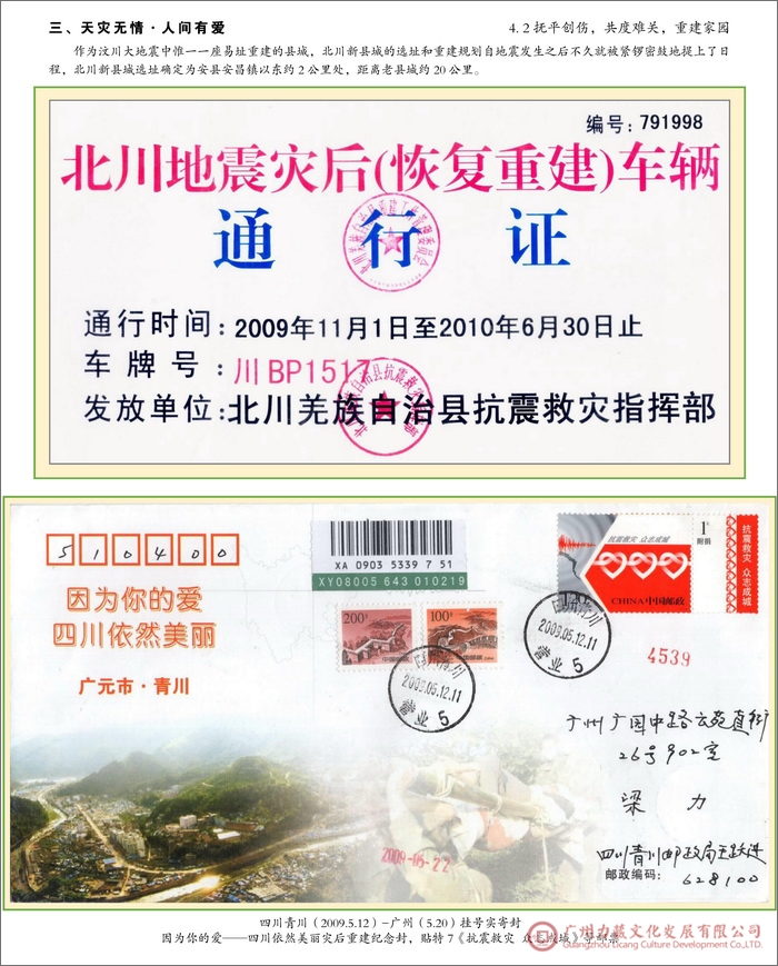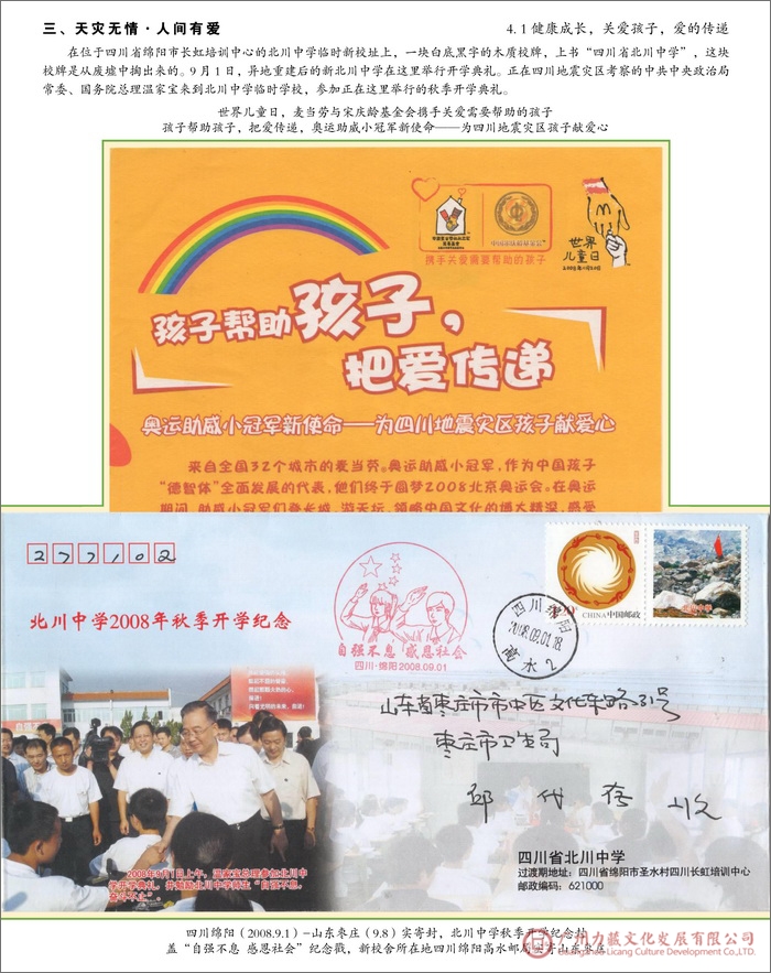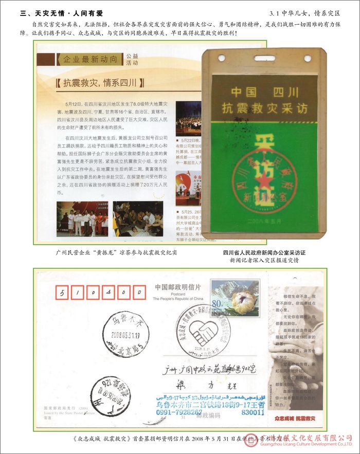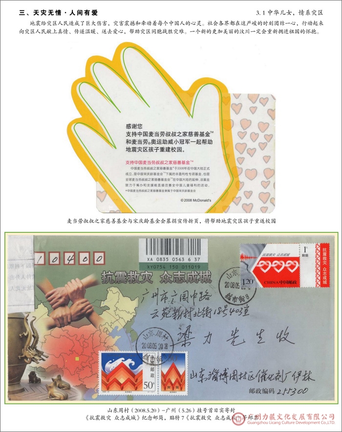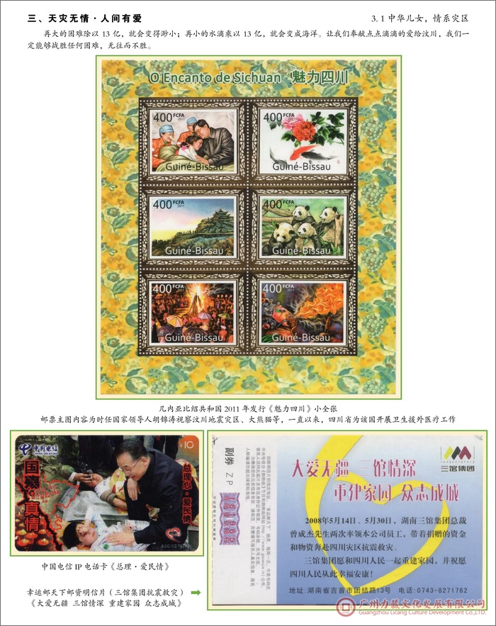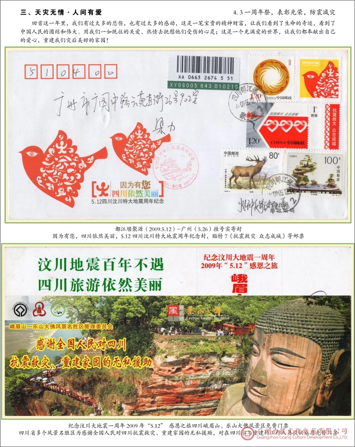 本邮集作者作为医务人员参与5·12抗震救灾,通过展示从地震灾区和全国各地寄出的实寄封片,以及反映抗震救灾的真实历史物品;介绍强震对生活、生产和邮政通信运输的影响,展现中华民族的中国心、抗震情。