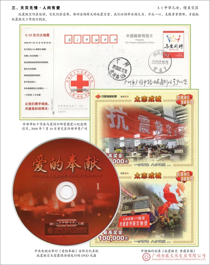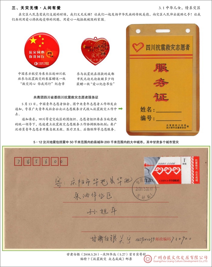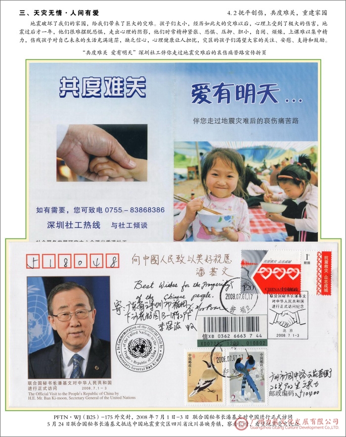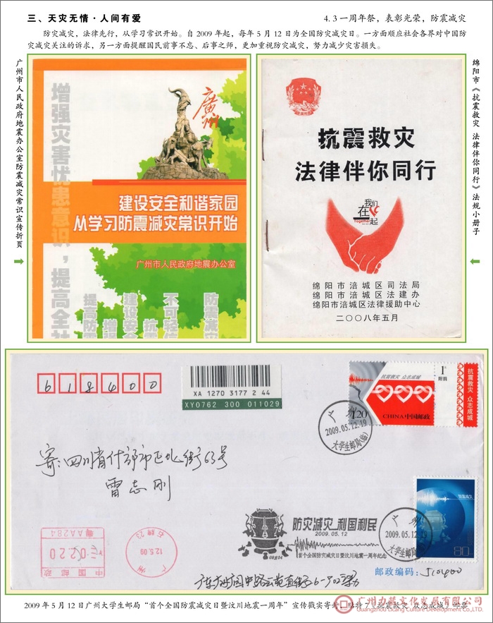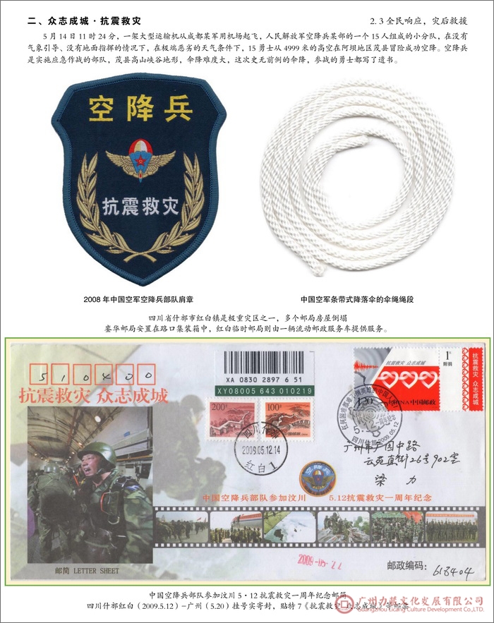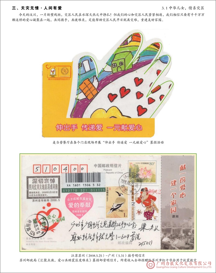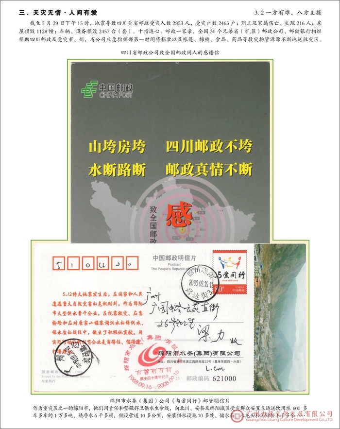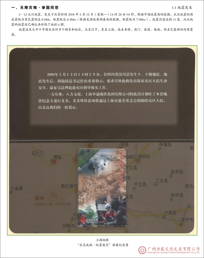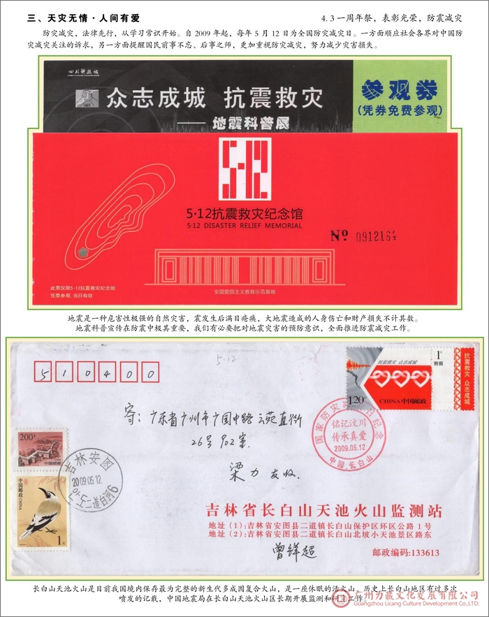 本邮集作者作为医务人员参与5·12抗震救灾,通过展示从地震灾区和全国各地寄出的实寄封片,以及反映抗震救灾的真实历史物品;介绍强震对生活、生产和邮政通信运输的影响,展现中华民族的中国心、抗震情。