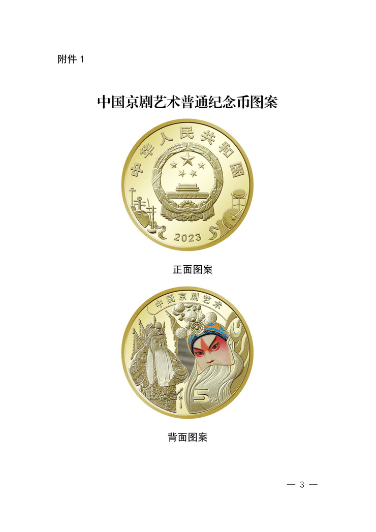中国京剧艺术普通纪念币正面主图案为中华人民共和国国徽,国徽上方刊“中华人民共和国”国名,下方刊年号“2023”字样,辅以中国戏曲乐器图案;背面主图案为中国京剧艺术中生角形象,局部为彩色图案,辅以装饰化图形,并刊“中国京剧艺术”及面额“5元”字样。图案见附件1。