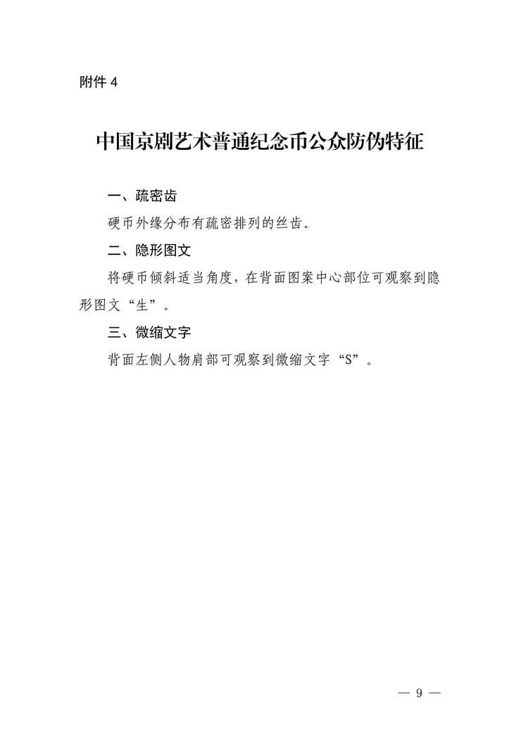 四、中国京剧艺术普通纪念币公众防伪特征见附件4。
