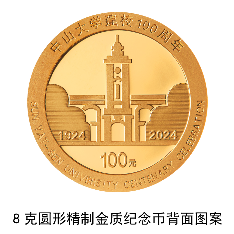 8克圆形金质纪念币背面图案为中山大学校徽的主体图案钟楼建筑,辅以“1924”、“2024”年份字样组合设计,并刊“中山大学建校100周年”中文字样、“SUN YAT-SEN UNIVERSITY CENTENARY CELEBRATION”英文字样及面额。
