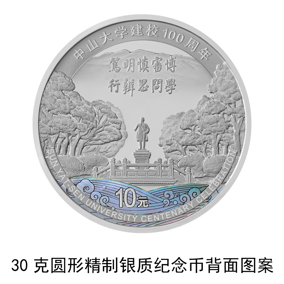 30克圆形银质纪念币背面图案为中山大学校园内孙中山先生铜像及周围景观,辅以校训“博学 审问 慎思 明辨 笃行”字样及云山珠水组合设计,并刊“中山大学建校100周年”中文字样、“SUN YAT-SEN UNIVERSITY CENTENARY CELEBRATION”英文字样及面额。