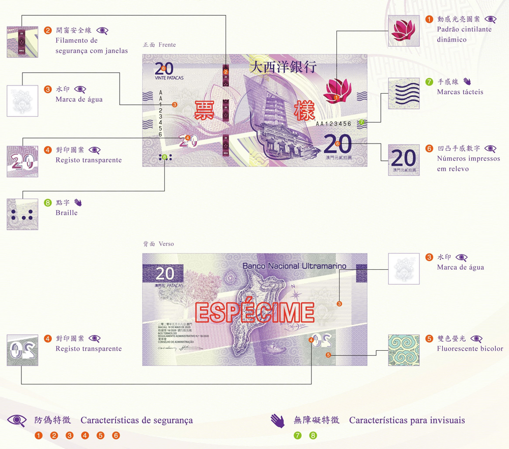 两家发钞银行的新系列钞票采用了统一的防伪特征布局,并透过每家发钞银行的独特主题,向公众展示多维度的澳门风貌。