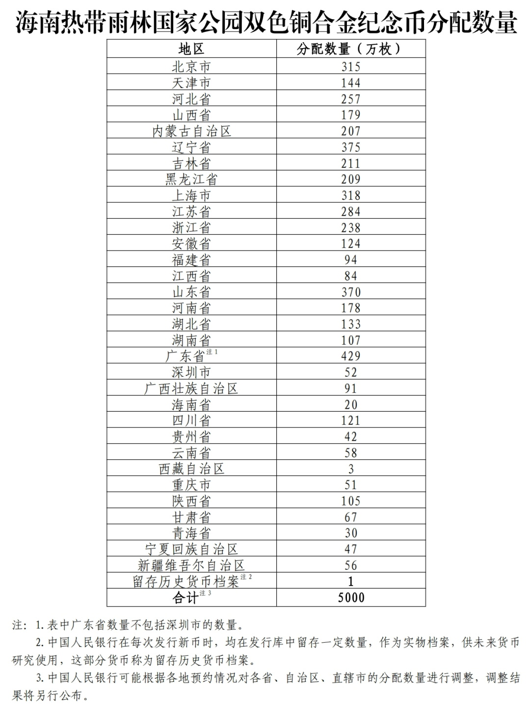 海南热带雨林国家公园双色铜合金纪念币面额为10元,直径为27毫米,材质为双色铜合金,发行数量为5000万枚。各省、自治区、直辖市分配数量见附件2。