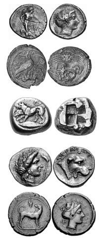 西西里钱币以图案精美而闻名于希腊世界,西西里岛南岸城邦阿克拉加斯的钱币多以螃蟹为背面图案。而在公元前五世纪末期,阿克拉加斯出现了一批四德拉克马银币,其背面的图案刻画了传说中的海怪斯齐拉。斯齐拉是希腊神话传说中专门吞噬水手的海妖,经常出没在墨西拿海峡。据说墨西拿海峡一侧有卡里布迪斯漩涡,另一侧为斯齐拉出没之地。船只若欲通过海峡,须交出六名水手。斯齐拉尾部为猫尾,两只猎犬长于其腰。猎犬因此借斯齐拉登上了钱币图案。中希腊色萨利的腓拉伊也曾一度将犬首作为钱币的背面图案。