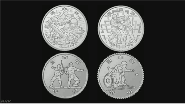 首批公布的纪念币分为一万日元(约合人民币593元)、一千日元和一百日元三种面额。其中一万日元的纪念币为纯金铸造,正面为运动员在马上射箭的骑射图案,并铸有“心技体”3个汉字。面额为一千日元的纪念币为铜币,正面图案分为两种,分别是游泳运动员和柔道选手。而一百日元面额纪念币正面则分别印有击剑和轮椅橄榄球两个项目的图案。同时,所有纪念币的背面都为东京奥运会会徽。