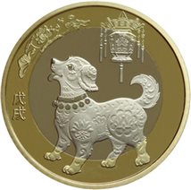 这枚2018年贺岁普通纪念币的正面图案为“中国人民银行”字样,并刊“10元”面额、汉语拼音“SHIYUAN”及年号“2018”,底纹衬以团花图案;背面图案为一只中国传统剪纸艺术与装饰年画元素相结合的小花狗造型,其上方为宫灯和荷花图案,币面左侧刊“戊戌”字样。该币的直径为27毫米,材质为双色铜合金。