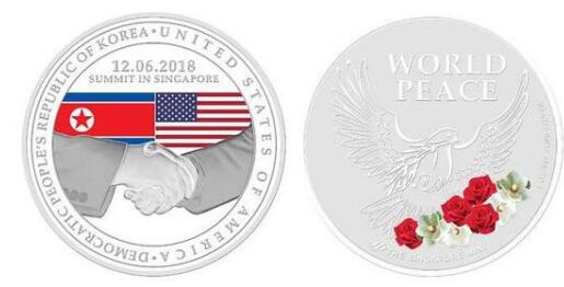 据《南洋视界》报道,造币厂此次采用高浮雕造币技术,在纪念章的正面刻上美朝首脑握手的图案,图案上方的左右两旁也分别印有朝鲜和美国国旗,象征两国的政治立场。