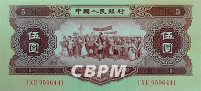1955年3月1日,第二套人民币公开发行,其中的五元券(主景为民族大团结,正面酱紫色、背面橙黄色)是由苏联帮助中国代印的。但是,就在这套人民币五元券公开发行不到一年时间,中国人民银行便于1956年1月提出,要重新设计、印制一套五元券(过渡版)。