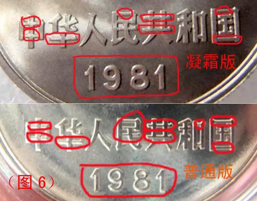 1、凝霜版(或称初铸币,见图4):沈阳造币厂生产,币面凝霜效果明显,凹入部分均无杂乱的铸造纹理,币面色彩一致、清新整洁;币边直、齿长呈直角状,币身较厚,凸显大气(见图5);币正面“中国人民共和国”国号及“1980”年号的字体,笔划宽平、粗细一致、尽显稳重(见图6),币的整体特征与1980年无砖版基本一致。