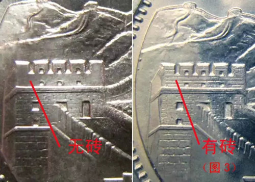 “无砖”、“有砖”两大特征的原因,主要是生产厂家对后期铸模进行了修正。因此,1980年有砖版也可说是壹圆长城币的定型版,而无砖版也可称为“试验版”或“错版”。(见图3)