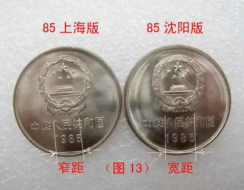 沈阳厂生产的1985年壹圆长城币(见图12、图13), 正面的年号字体较大、字间距较宽;背面长城图案上方凹入部分无彩虹状痕迹,长城图案中右起第二个城楼下方的第二个台阶,与第一个台阶呈平行状;币的凹入部分有杂乱的线状铸造纹理,金属质感较强。