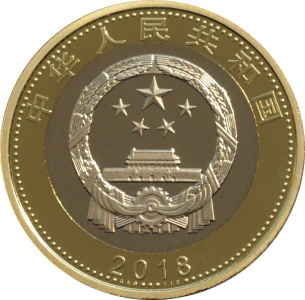 中国高铁普通纪念币正面图案为国徽,其上方刊“中华人民共和国”国名,下方刊年号“2018”字样;背面图案主景为“复兴号”动车组,背景为大胜关长江大桥、北京南站、“复兴号•中国高铁”文字及高山、梯田、沙漠等。主景上方刊有面额“10元”字样。(图案见附件1)二、普通纪念币面额、规格、材质和发行数量