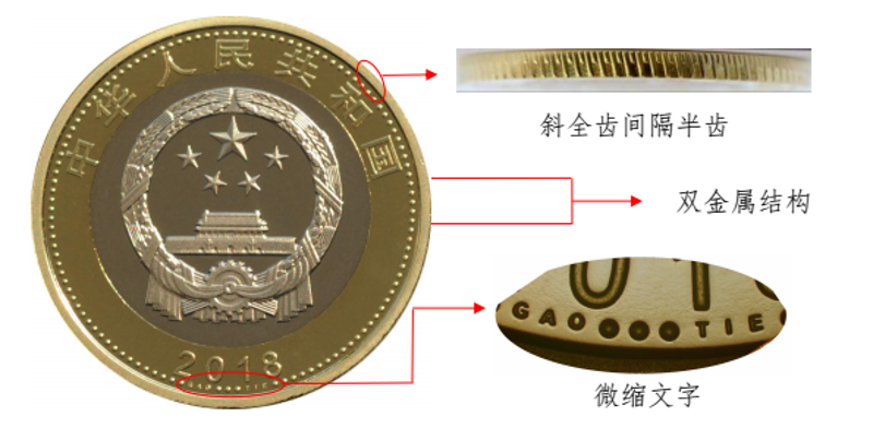 硬币外环为黄色铜合金,内芯为具有独特机读性能的镍带复合白铜材料。