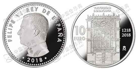2018年是萨拉曼卡大学建校800周年,为铭记这所历经八个世纪沉浮的古老学府,西班牙中央银行于2018年发行萨拉曼卡大学建校800周年纪念银币一枚。该币为西班牙法定货币,由西班牙皇家造币厂铸造。