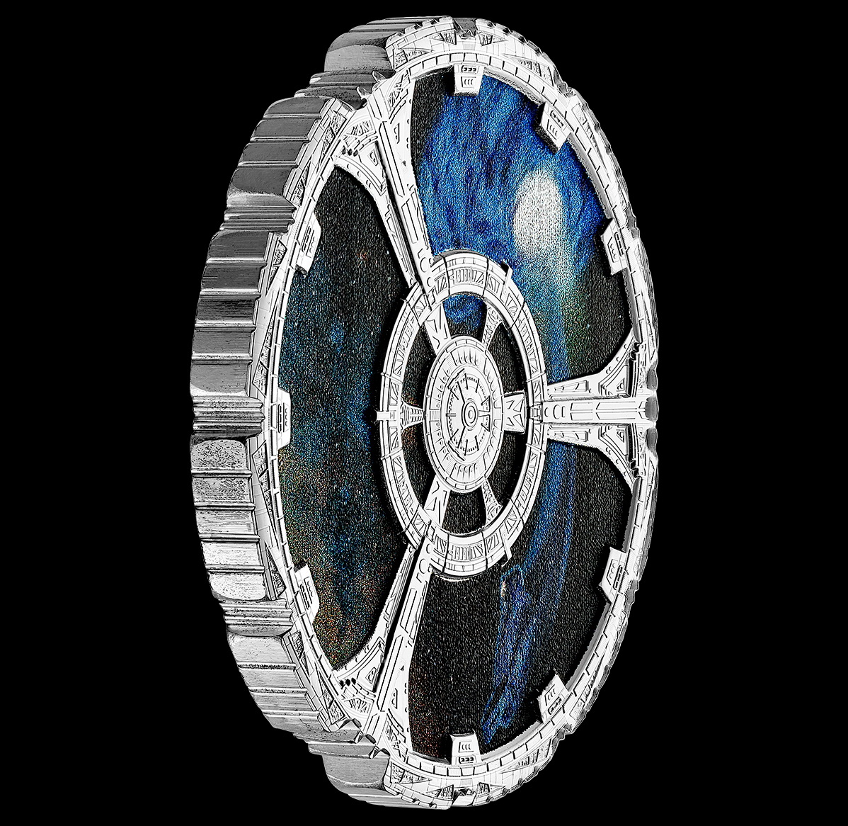该币采用了与深空九号空间站相同的形状,即最中心处为核心区,由三座等分的桁架通道由核心区向外水平辐射,连接内环,内环又通过三个桁架连接外环与对接区。彩色部分为星空图案,其中左上方的白光部分为贝久虫洞图案。