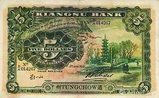 充当“急先锋”的,是民国二年(1913)江苏银行发行的伍圆兑换券(图1)。此券纵10.9、横17.2厘米,由英国印钞公司印制,背图为上海龙华塔。1912年元月,在苏州阊门西中市筹备设立的江苏银行正式成立。同年2月,该行总行由苏州迁往上海江西中路371号。