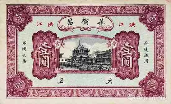 位于湖南省怀化市西南部的洪江,为华夏杂交水稻之发源地。民国年间,此地的华衡昌钱庄曾发行过壹圆光洋券(图6),其正面即带有上海豫园湖心亭的图景。此券纵9.6、横15.7厘米,由湖北省汉口石印公司印制。