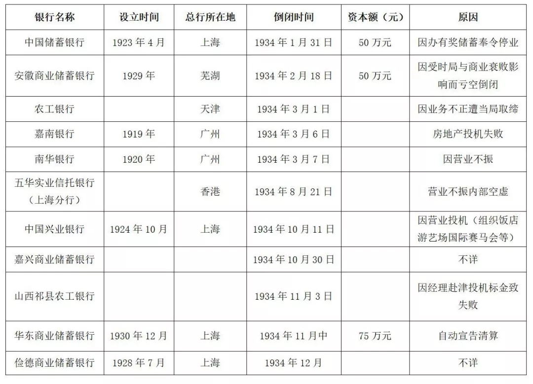 1934年房地产价格波动剧烈,表1中一部分银行因地产经营失败而倒闭。据1934年《中国经济年报》分析,华东商业储蓄银行的倒闭,一半就是因为地产投机失败,广州嘉南银行和南华银行的破产,主要也是因为房地产押款太多,一时不能周转。嘉南银行原名“嘉南堂实业团”,创立于1919年,设营业处于广州,由基督教徒及华侨初集资本毫银10万余元组成,经营储蓄部(即三益会)存款置业等业务,两年间业务颇好,乃于1921年改名为“嘉南堂置业公司”。于1922到1923年间开始购地建楼,建嘉南堂东西楼,耗费毫银约170万元。自1929年起,经济不景气,提款人比存款人日见增加,库存现金难以周转,开始向其他银行、公司借款以资维持。1933年,依法申请改组为“ 嘉南实业储蓄银行股份有限公司”,当时立案资本额为毫银30万元(但实际股份增至30余万元)。后所有产业抵押净尽,仍无法应付存款人的提款,1934年3月依法院宣布停业清理。随后该行与债权人达成和解,组织债权团监察收支,但其清理工作一直持续至1950年。