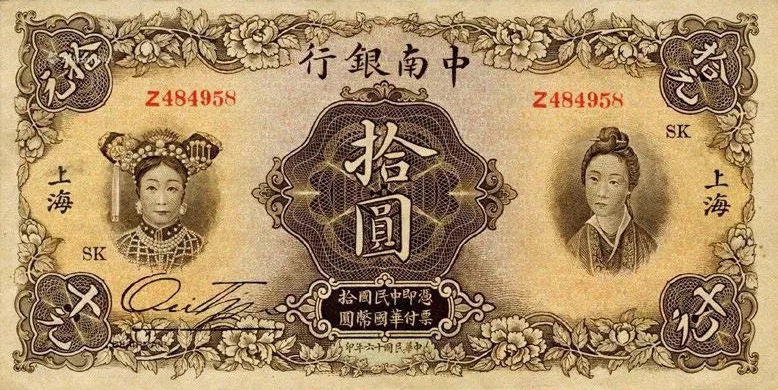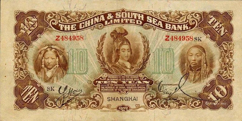 至今,票上五女能确认其身份的唯有慈禧太后一人,不过,笔者认为五女皆是身份显贵之人,决心找到更多线索加以辨明。假若戎装女子长期被认定是香妃的话,五女恰是代表了五个不同的民族,乃呼吁五族共和之意。中南银行设计票面时的初衷该当如此吧。中南银行纸币回收率非常高,存世量稀少,且因纸币保存不易,拍卖价格逐年增长,在市场上越来越难见到。集合五族妇女、设计精美、寓意深厚的1927年版钞票更加珍贵和抢手,在各大拍卖会中均有着不俗的成交价格。在2014年12月澳门的一场纸钞专场拍卖会中,一枚中南银行的五女图壹圆纸币,以26290美元成交,约合人民币16万元;在北京诚轩2015年春拍纸币专场中,一枚品相较差的中南银行五女图拾圆纸币,以人民币5750元成交。中南银行钞票是集历史、政治、经济、美术、工艺于一身的特殊载体,不但价格不菲,其深层价值也有待我们进一步发掘、传承。