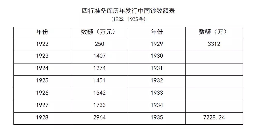 1921年7月11日,北洋政府特批中南银行享有钞票发行权,到1935年颁布法币政策,中南银行的发行权被取消。在14年的发行史中,中南银行共印制了六版纸币:第一版为1921年美国钞票公司印制的日晷图案钞票,面额为1元、5元、10元、50元、100元5种;第二版日晷图案钞票于1924年发行,面额为5元和10元,与第一版相仿;第三版日晷图案钞票于1927年发行,面额均为5元,颜色有红色和紫色两种,不久后市场上出现伪钞,故全部改为青色;第四版钞票1927年发行,由英国华德路公司承印,图案为满、汉、蒙、回、藏五族妇女半身像。面额1元的为竖型,正面中文、背面英文,正面上部有3个半身像,中间为袁世凯银元反面图案,反面上部有2个半身像,中部为袁世凯头像银元正面图案;面额10元的为横型,正面2个半身像分布左右,中部为“拾圆”面值字样,背面有3个半身像及英文面值“ten”字样;第五版钞票是1931年华德路公司印制的日晷图案钞票,仅有1元面值,与美国钞票公司的设计有所差别;第六版钞票于1932年发行,面额仅有5元,图案为日晷,由德纳罗印钞公司印制。