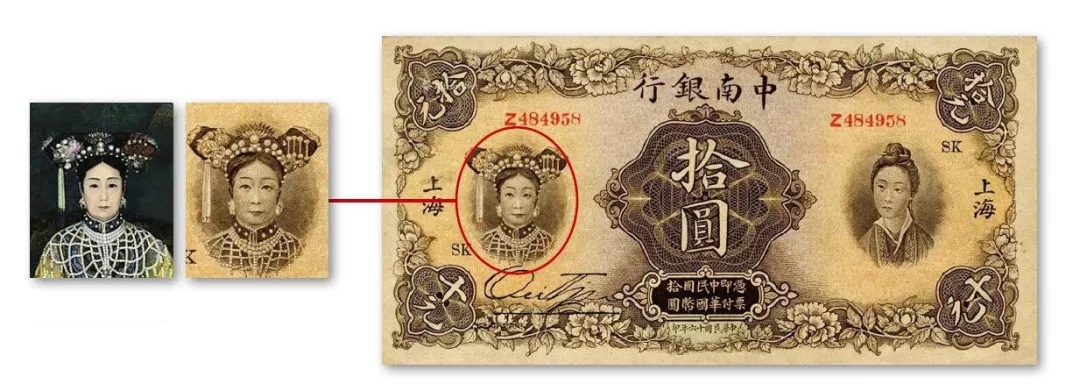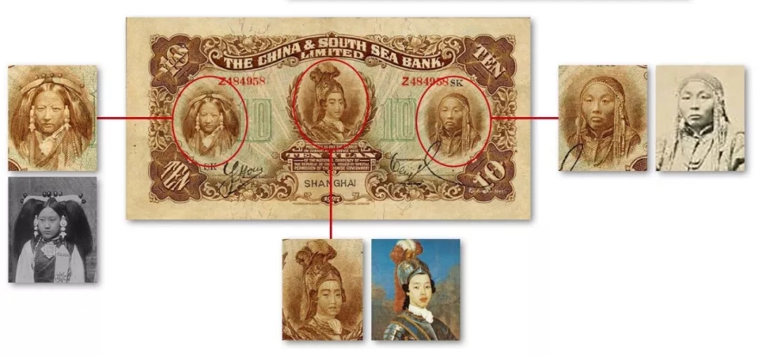 纸币上戴旗头的满族女子为慈禧太后,这个说法广为流传,经比对,纸币上的慈禧太后像与美国女画家凯瑟琳•卡尔(Katharine Carl)1904年绘制的慈禧太后画像完全吻合。清末,卡尔受邀进宫为皇室成员绘制肖像,她在回忆录《在太后身边的日子》中讲述了她眼中的清宫生活和作画经历。据她的描述, 她在上海逗留期间收到美国驻北京公使夫人康格女士的来信,信中请她进宫为慈禧画像。康格夫人希望慈禧太后能够同意把画像送到圣路易斯博览会去参展,外面的人如能亲眼目睹慈禧太后的真实容貌,或许会改变对太后抱有的偏见,甚至能帮助改善清廷的形象。慈禧太后同意了以上请求,但是,她对西洋画心存疑惑,在细节上提出了许多个人意见,比如画面不能有阴影,不能使用透视原理等,这让卡尔心中嘀咕,这样的画作没有立体感,人物形象也无魅力可言,但是作为一项政治任务,她还是认真完成了慈禧的要求。画作完成后, 慈禧太后非常重视,特意挑在1904年4月19日吉时举行完工仪式,邀各国使节夫人前来欣赏,随后又传去后宫供人瞻仰。6月19日,太后“圣容”经长途跋涉出现在博览会揭幕仪式上,神秘的东方国家统治者第一次在西方“露面”,引起了世人的关注。博览会闭幕后,这幅画被清廷作为国礼赠予美国政府,由时任美国总统的罗斯福接受,并转交史密森尼学会收藏,油画外交至此圆满完成。慈禧太后典型的皇室服饰风格作为满人形象的代表,为中南银行设计钞票图案时所选用。