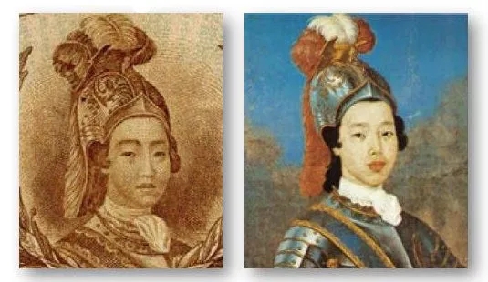 戴头盔、着戎装的女子长期被认定为乾隆宠妃容妃,即赫赫有名的香妃,另有一说认为是乾隆的女儿固伦和孝公主。容妃为回部贵族首领阿里和卓之女,因叔、兄配合清军平定大、小和卓叛乱有功,全家被乾隆帝召见封赏,出于政治联姻的目的,和卓氏受封和贵人被选入宫。和贵人容貌绮丽,又是异族功臣之女,不久就擢升为“容妃”。关于容妃的传说数不胜数,比如她通体异香,深受皇帝宠爱,跟随乾隆南巡、东巡,地位仅次于皇后、贵妃;再比如她至死不从乾隆,固守维族的生活习俗,最终为太后赐死。1914年,故宫古物陈列展出了一批清宫文物,其中有一幅年轻女子的戎装像,挂在武英殿后的浴德堂内。画像下面附有说明文字,“香妃者,回部王妃也。美姿色,生而体有异香,不假熏沐,国人号之曰香妃。”从此以后,香妃之名广为人知,这幅画像也被定为香妃戎装像。后来此画到了台湾,曾作为郎世宁人像画陈列于台北故宫博物院中,并选入《故宫图像选萃》,书中定名为“香妃像”。不曾料想,故宫博物院资深专家朱家溍先生专书一文《来自避暑山庄的一件画屏》澄清了此事,原来,画中女子“大概就是香妃吧”起源于民国政府负责人内务部总长朱启钤的一句随意之谈,经文物直接经办人曾广龄证明,这幅画像的原始记录上只有“油画屏一件”而已,并没有确切证据能断定其身份。如果不是香妃,这幅宫廷画像上的女子还有可能是谁呢?实际上,乾隆身边的确有一位喜穿戎装的女子,就是他钟爱的第十个女儿,和珅的儿媳妇固伦和孝公主。史料记载和孝公主“性刚毅,能弯十力弓,少尝男装随上较猎,射鹿丽黾,上大喜,赏赐优渥”。她经常跟随乾隆一起出巡、秋弥,她用过的弓箭、盔甲、马鞍、撒袋等物品,后来一直为乾隆的皇孙辈所用。乾隆曾夸赞她道,“汝为皇子,联必立储也”。画中人若是和孝公主该是更为合理。不过,此画的原作现藏台北,画上也无题跋之类的补充信息,妄作推断仍是不够严谨。既然画作出自清宫内苑,画中人纵使不是香妃或和孝公主,也应是皇亲国戚。不知作此种绘画,是出于对戎装武术的喜好,还是一时兴起的游戏之作。无论如何,画中女子独特的装扮与风采在院藏绘画中独具一格,难怪会入选中南银行五女钞了。