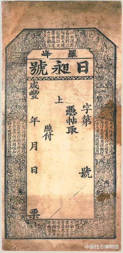 最近在编著山东近代货币丛书“山东地方政权流通券” 与“山东省地方钱票券”中、收集到至今为止山东省发现钱票幅最大(225 ×111mm)、发行最早的清咸丰年招远县罗峰日昶钱票。纸币由棉纸印刷, 纸币为深蓝色、而且印制特别精美, 应是清早期使用牛角制版、印制的钱票。钱票为单面, 票正面分别印有四段中国古典文学文言文及与其相关的历史人物故事。