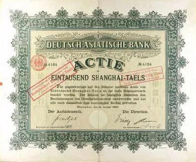 德华银行(Deutsch AsiaticBank)是由德意志银行、国家贴现公司和瓦沙公司发起创立,再加上华泰银行、斯坦因洋行,五个机构共投资230万两。这些德国资本家决定仿照汇丰银行的模式,在中国最大的商埠上海开设一家德国银行。这项计划从酝酿到最后成立,始终都得到了德国政府强有力的支持,甚至给予了最直接的指示和建议。德国政府希望德华银行能够肩负起投资银行的职责,执行德国资本输出的任务,成为德国在远东的重要据点,加强德国工业品在中国的竞争力量,并扩大在远东的贸易。