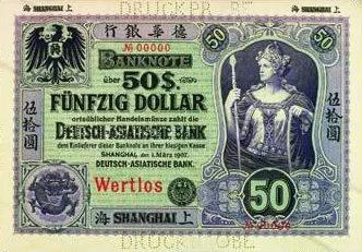 德华银行发行纸币,是经过德国宰相特许的,准许其在1904年起的15年内,在德国租借地胶州湾及中国其他各地享有发行兑换券的特权。该行纸币共分上海、北京、天津、汉口、青岛5种地名券,每个地名券又都有银圆票和银两票之分。其中,上海总行发行的上海地名券,大体可细分如下:
