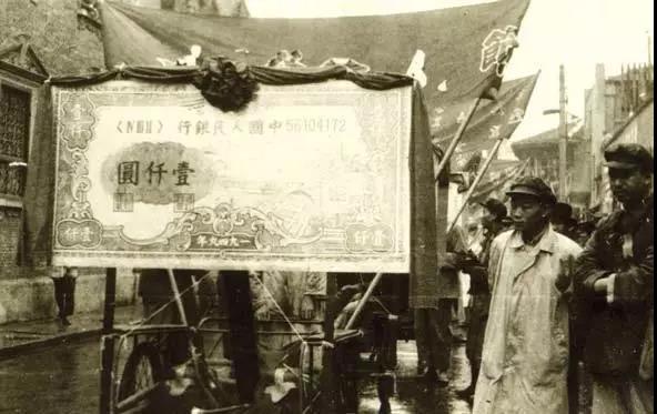 展现在我们眼前的这张照片,是银行系统制作的宣传牌,摄于1950年的上海市民庆祝国庆时。内容是关于一张面值壹仟元的人民币宣传画,为当时人们使用最频繁的货币单位之一。它的登台亮相伴随着人民币在上海不同凡响的经历。