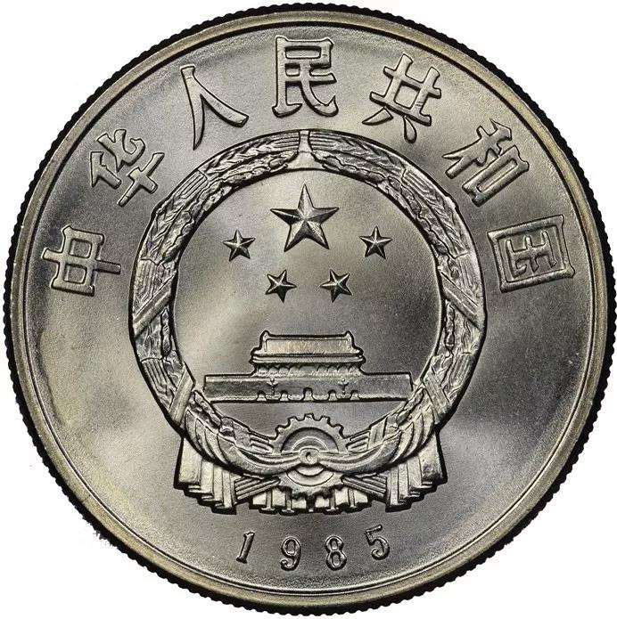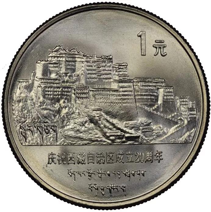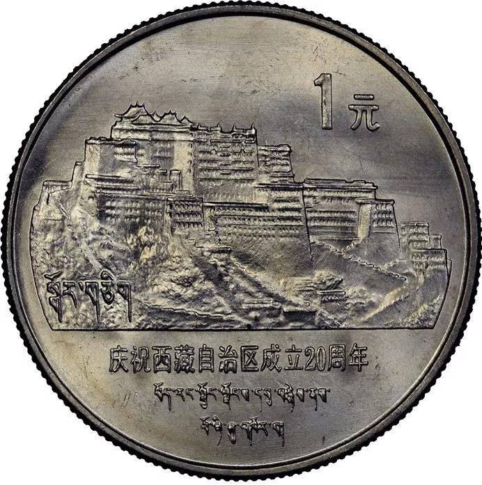 我们来看一枚铜镍合金1元硬币。1985年发行了多枚铜镍合金1元硬币。今天所讨论的这一枚是为庆祝西藏自治区成立20周年而发行的。硬币背面的图案是布达拉宫,根据此面图案设计的不同,可以区分不同版别。布达拉宫始建于公元7世纪,依山垒砌,超过13层楼高,宫墙红白相间,非常震撼。这枚硬币按布达拉宫距离币缘的远近,可分为两个不同版别。