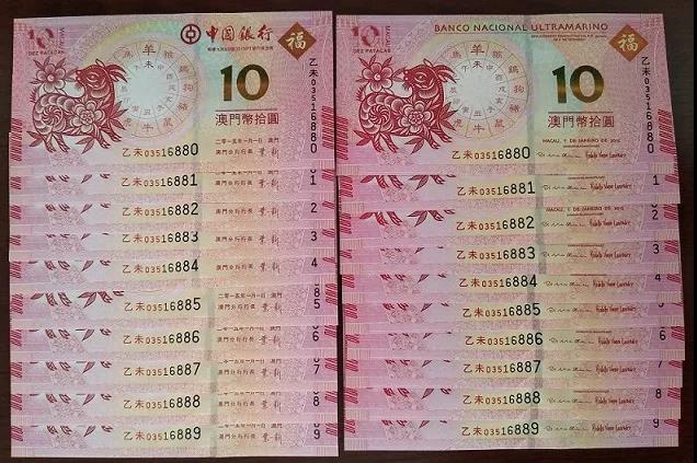 3、所以标准十连号是有整刀百连再一次细分出来的,如果纸币的整刀百连是0-99,那这个标准十连号的排序就是0-9,10-19,20-29这样,譬如我国澳门的生肖纪念钞就是如此: