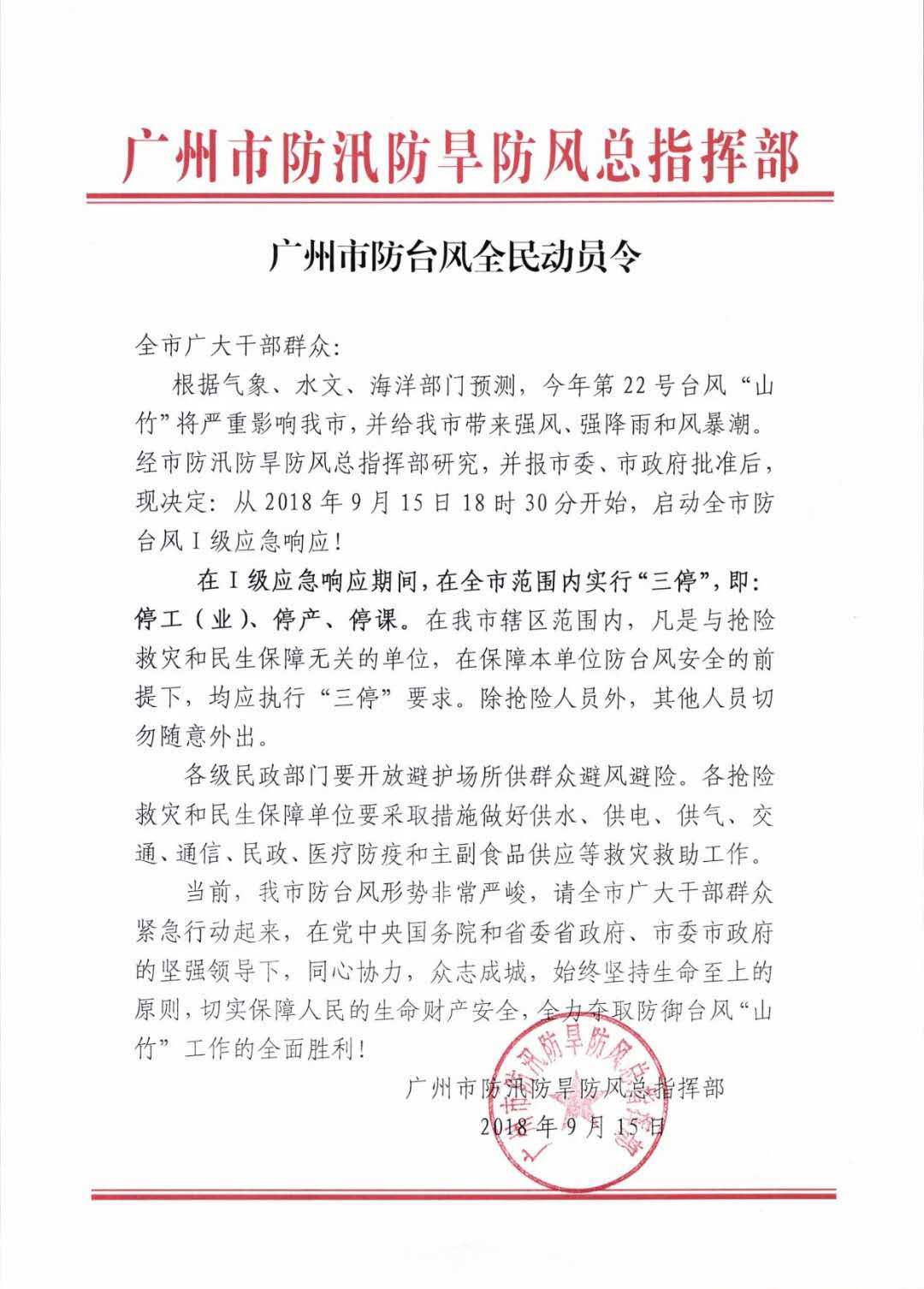 根据气象、水文、海洋部门预测,今年第22号台风“山竹”将严重影响我市,并给我市带来强风、强降雨和风暴潮。经市防汛防旱防风总指挥部研究,并报市委、市政府批准后,现决定:从2018年9月15日18时30分开始,启动全市防台风I级应急响应!