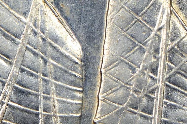 很多假币都是采用翻模法铸造的,高点处细节较弱、较模糊。这是因为铸造假币的模具是使用弱打的真币作为模板制造的。虽然假币的高点处也有均匀一致的光泽,仿佛全打一般,但细节仍有遗漏或是不够清晰。