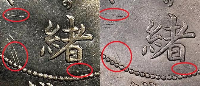 辨别假币的最好方式是通过它们图案高点处模糊不清的细节和似乎“混合”进底板的汉字来辨别,假币缺乏真币图案的清晰度。由于收藏家们现在正在研究这枚钱币的模具,因此同模假币也正逐步被识别出来。NGC保留了大量诊断图像档案。