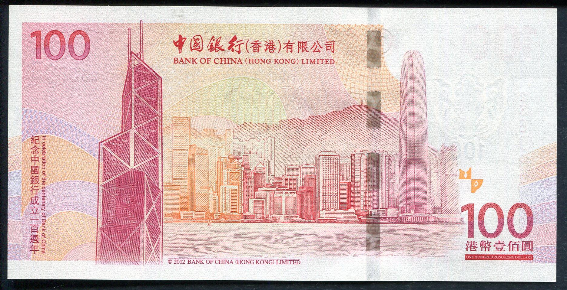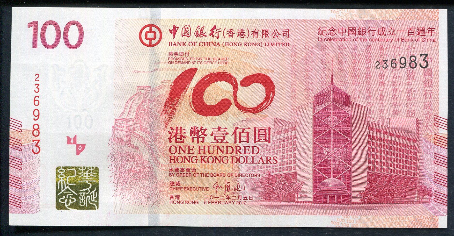 中银香港发行的“中国银行百年华诞纪念钞票”,正面主景是北京的中国银行大楼,配以万里长城及1912年《申报》关于中银成立的报道,中部以无限符号砌出“100”面额,同时寓意银行无限广阔的发展前景;纪念文字为“纪念中国银行成立一百周年”。