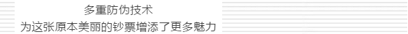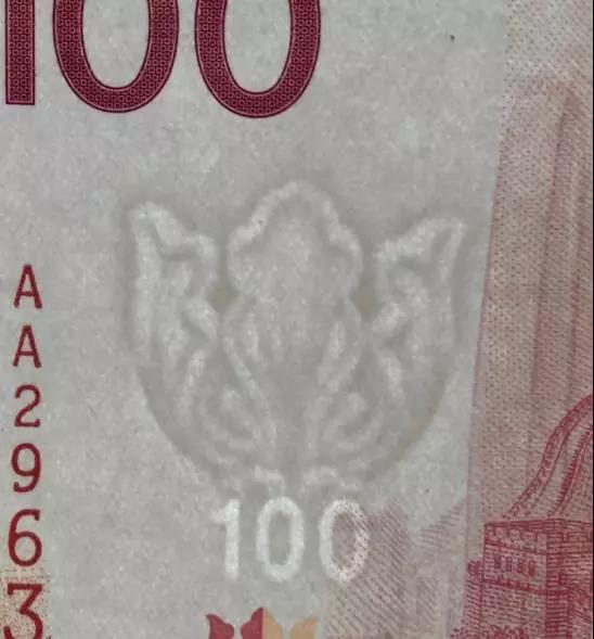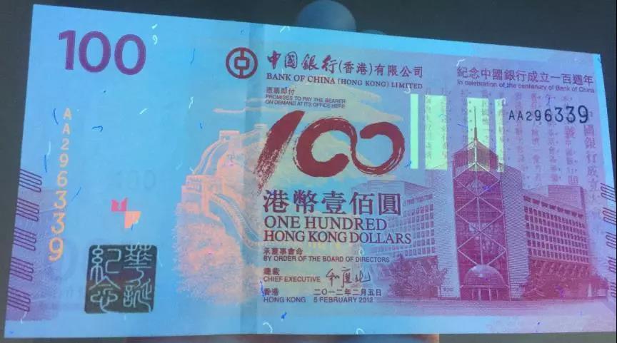无色荧光油墨印刷工艺。不同于我国常见纪念钞上使用“100”字样的荧光图案,这张纪念钞用特定波长紫光灯观察,在钞票正面中间偏左上部位可以看到条形码式的无色荧光油墨图案,共有四条,从左向右分成一窄一宽、一宽一窄两组,颜色呈黄绿。