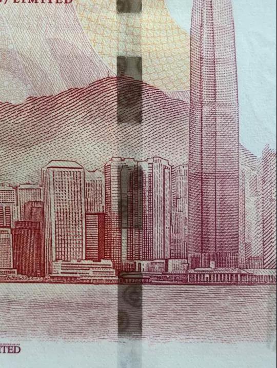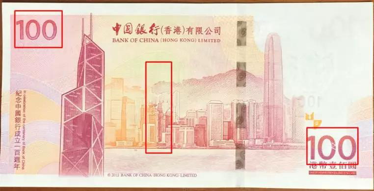纪念钞背面左上角与右下角两个面额数字“100”、港币纪念钞背面中间香港中银大厦和维多利亚港衬景图案,采用雕刻凹版印刷接线技术,橘黄色与两边的红色两种颜色对接自然完整。