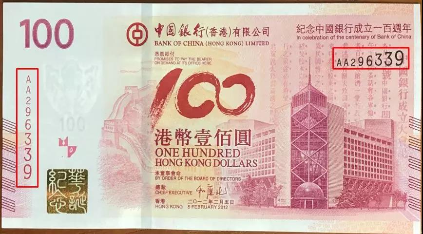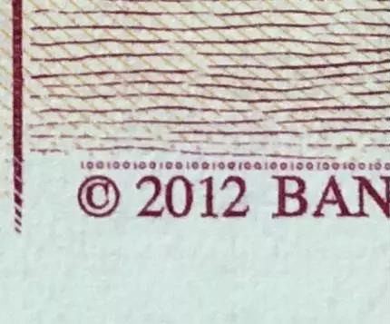 凹印缩微文字工艺,港币纪念钞背面中间下方英文“2012BANK OF CHINA(HONGKONG)LIMITED”上的一条直线,用放大镜观察可见“100”字样面额数字。背面左上角面额数字“100”中间是由缩微的灯笼形中字填充的。